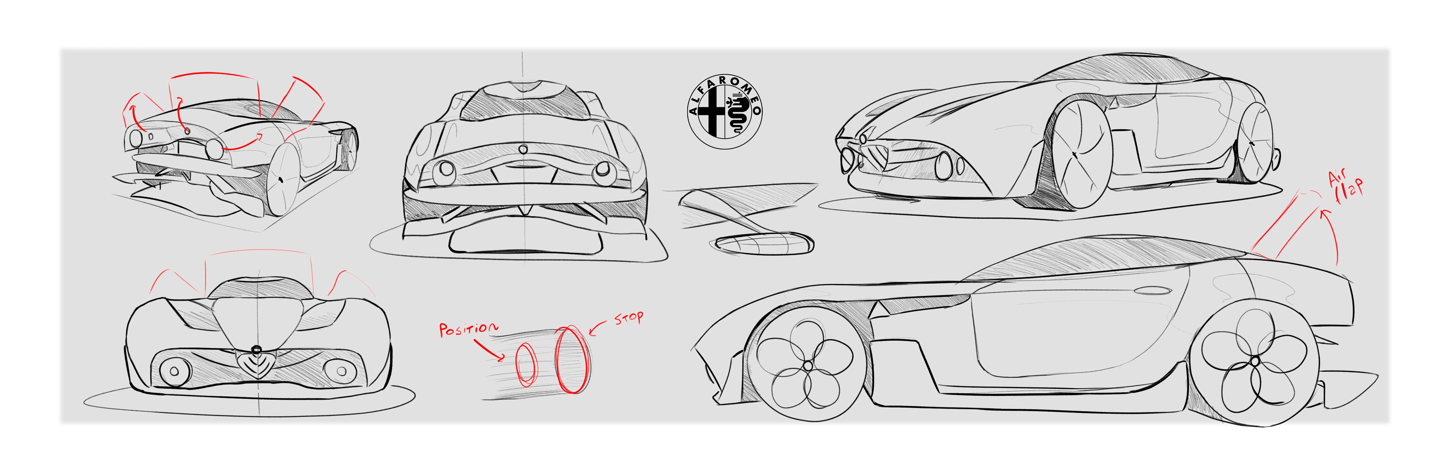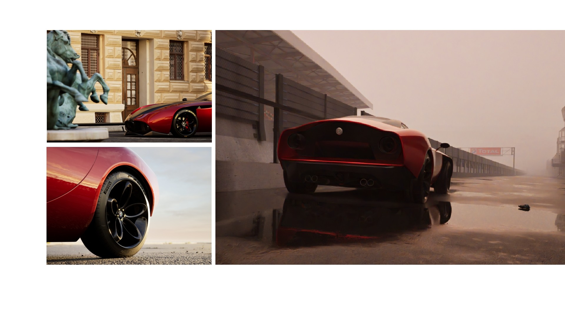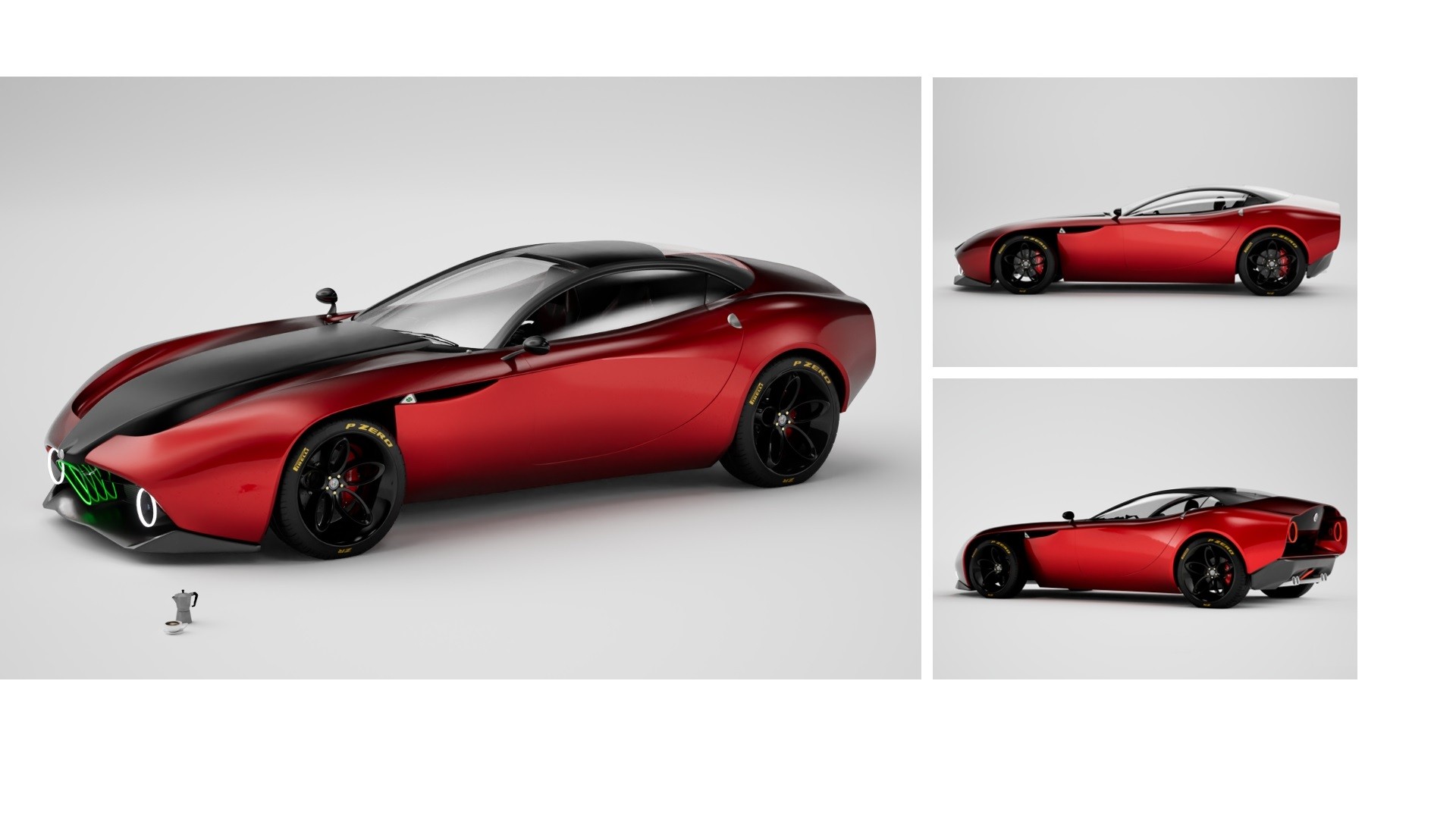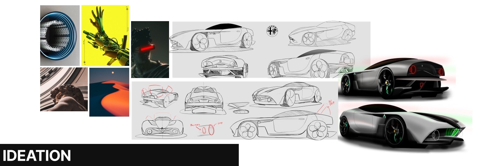 In this design exercise, the Alfa Romeo TZ-3 was taken as a reference, and its exterior was adapted to a more contemporary language. The aim was to preserve the Alfa Romeo DNA with its organic lines, creating a blend between the classic and the modern.