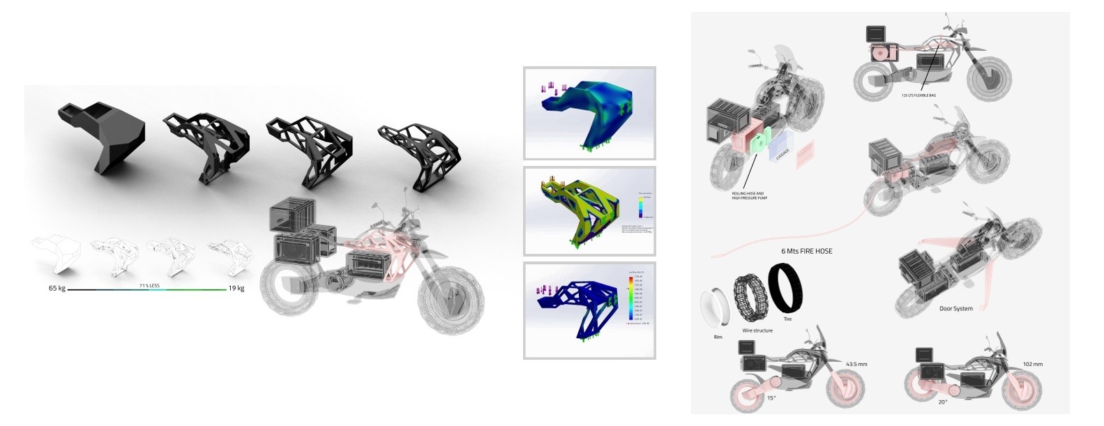 A Honda motorcycle concept developed in collaboration with product designer Camila Serrano. This project focuses on providing forest rangers with a high-mobility vehicle for rapid terrain navigation and early-stage fire mitigation. The design leverages topology optimization to minimize weight while maximizing chassis stiffness. Its aesthetic draws from Honda’s iconic design language, evolved into a futuristic, high-tech identity.